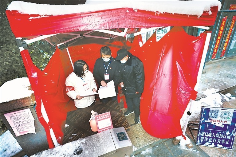 2月7日,江苏省盱眙县纪检监察干部冒着大雪,深入一线,督促职能部门抓好疫情防控。 王小龙 摄