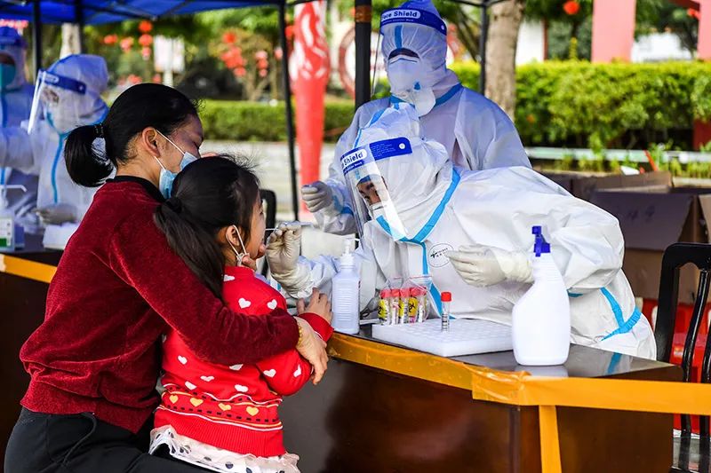 2022年2月16日,在广西百色市德保县,医务人员在做核酸采样。