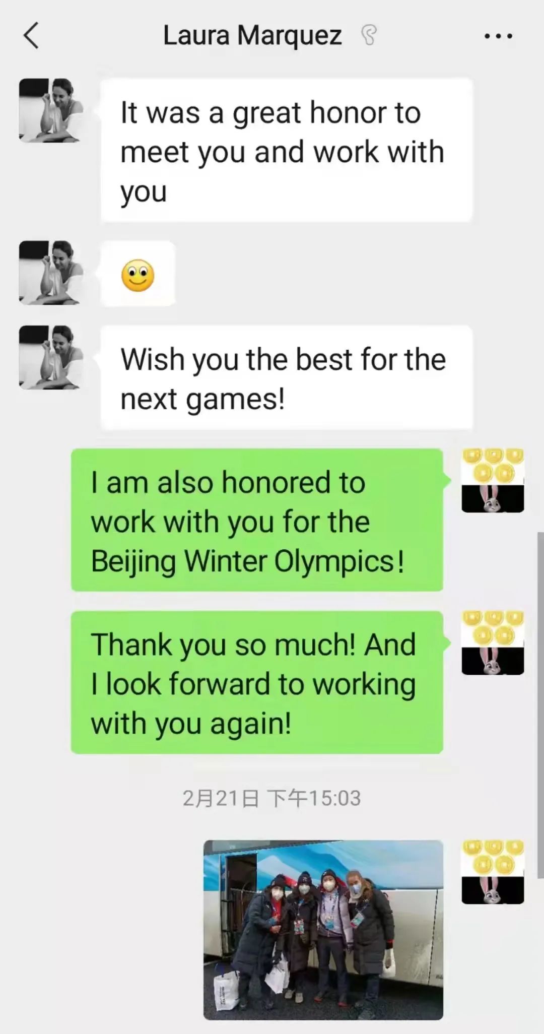 冬奥会期间,张家口冬奥村安保工作团队李华峰负责对接IOC考察团,全程解答安保领域各类问题。冬奥会结束后,张家口冬奥村经理Laura专门发微信表示感谢。译文:非常荣幸和你认识并在一起工作。希望你在接下来的冬残奥工作中一切顺利。