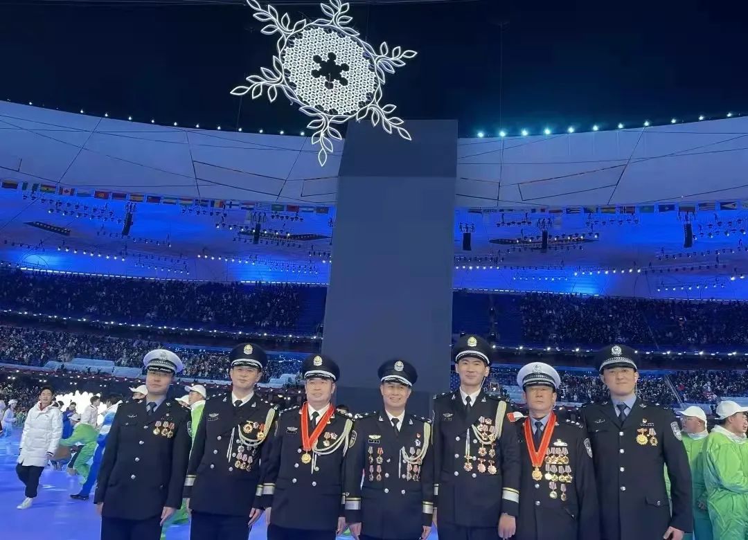 2月4日,参加北京冬奥会开幕式传递中华人民共和国国旗的公安民警代表在现场合影留念。左一为范京伦。