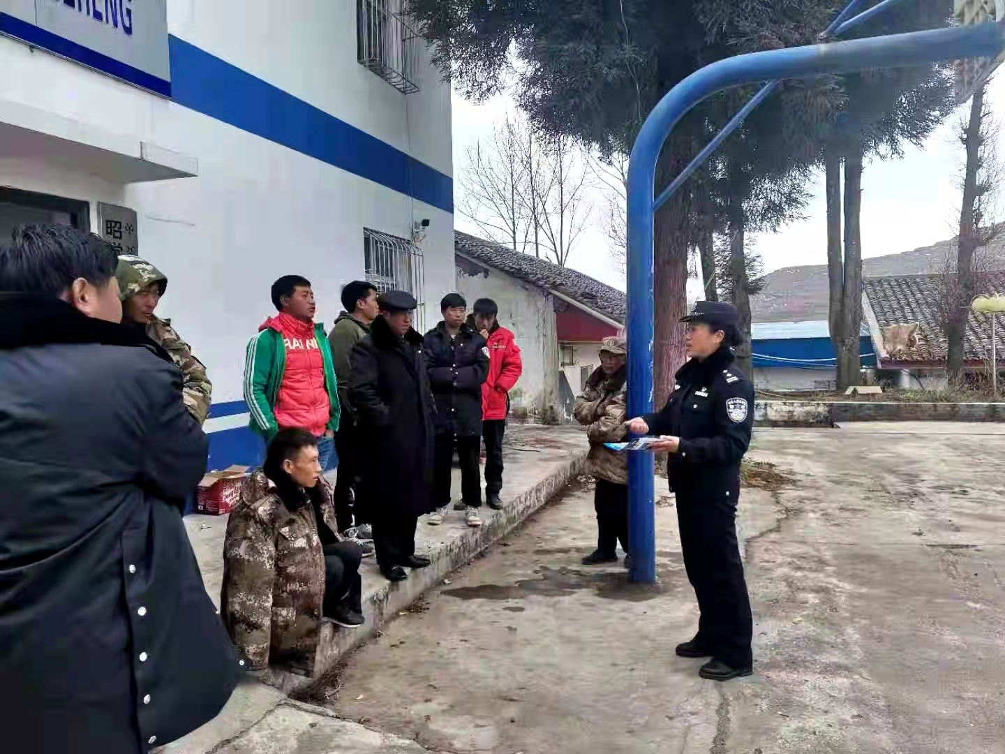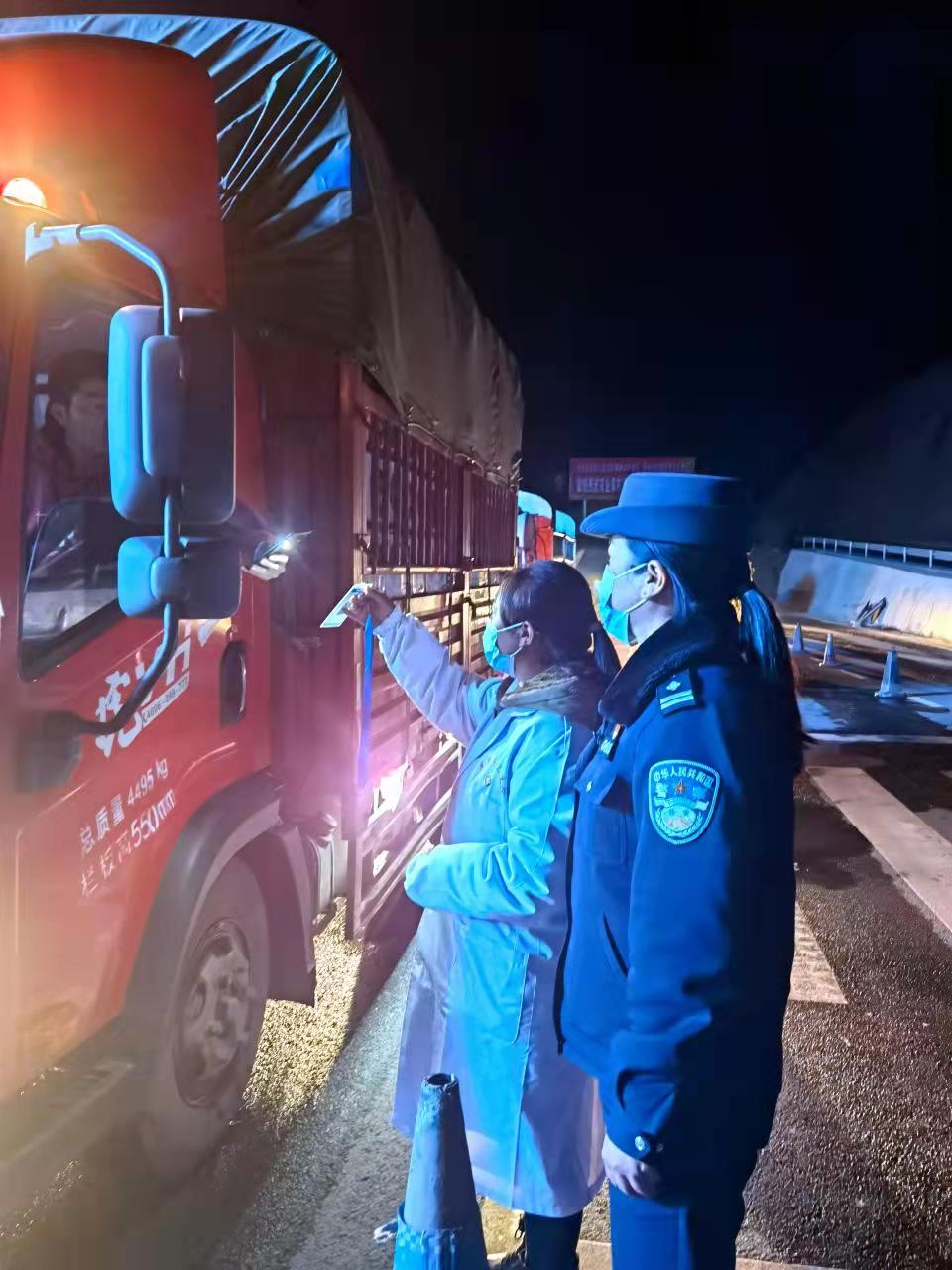 雪夹杂着冰凌,树和山都披上了一层银装,风雪弥漫着山谷、道路和村庄。路旁的活动板房掩映在朦胧的雾中,旁边有几个身影,走近你会看到,一位个子不高的女警在风雪之中忙碌着,她一边核查来往车辆的健康码、行程码,一边提醒司机注意行车安全。有的车辆打滑,他们要帮助推车;有老乡拉货的三轮车坏了,他们要帮着修理,趴在湿滑的路上安装链条。