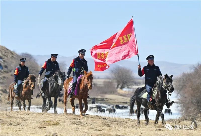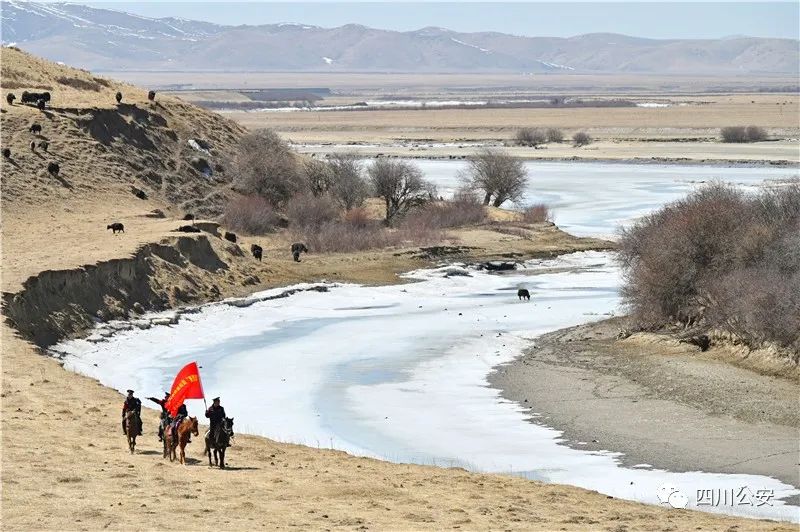 法治宣传活动结束后,“草原星”法治宣传服务队在若尔盖县公安局唐克派出所所长尕让甲木措的带领下,骑马来到黄河岸边进行巡逻,查看有无盗采砂石、非法捕捞等违法行为发生。