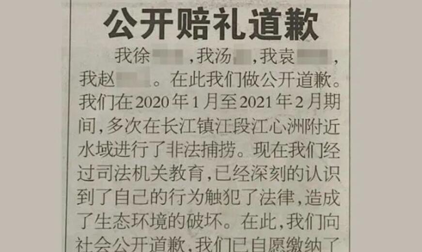 “现在经过司法机关教育,已经深刻认识到了自己的行为触犯了法律,造成了生态环境的破坏。在此我们向社会公开道歉,我们已自愿缴纳了生态修复费用,希望社会能够对我们的行为给予谅解。”日前,汤某等四被告在省级媒体上就自己在长江水域非法捕捞的行为公开向社会赔礼道歉,深刻认识到自己的错误。