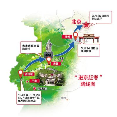 1949年3月23日,西柏坡。“进京赶考去!”毛泽东率领中共中央机关从这里动身,当夜宿住唐县,3月24日抵达涿县(今涿州市),3月25日进驻北平。