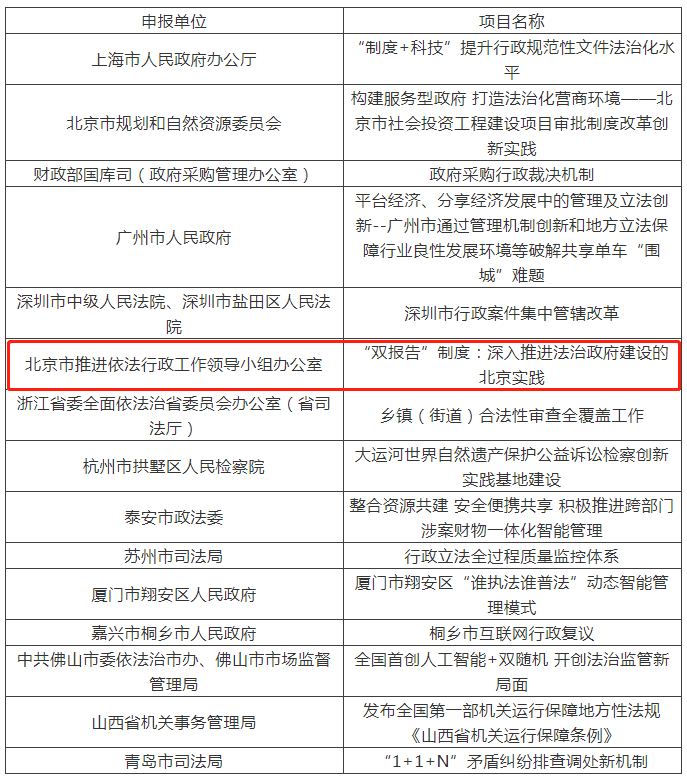 近日,第六届“法治政府奖”揭晓“'双报告'制度:深入推进法治政府建设的北京实践”获奖。