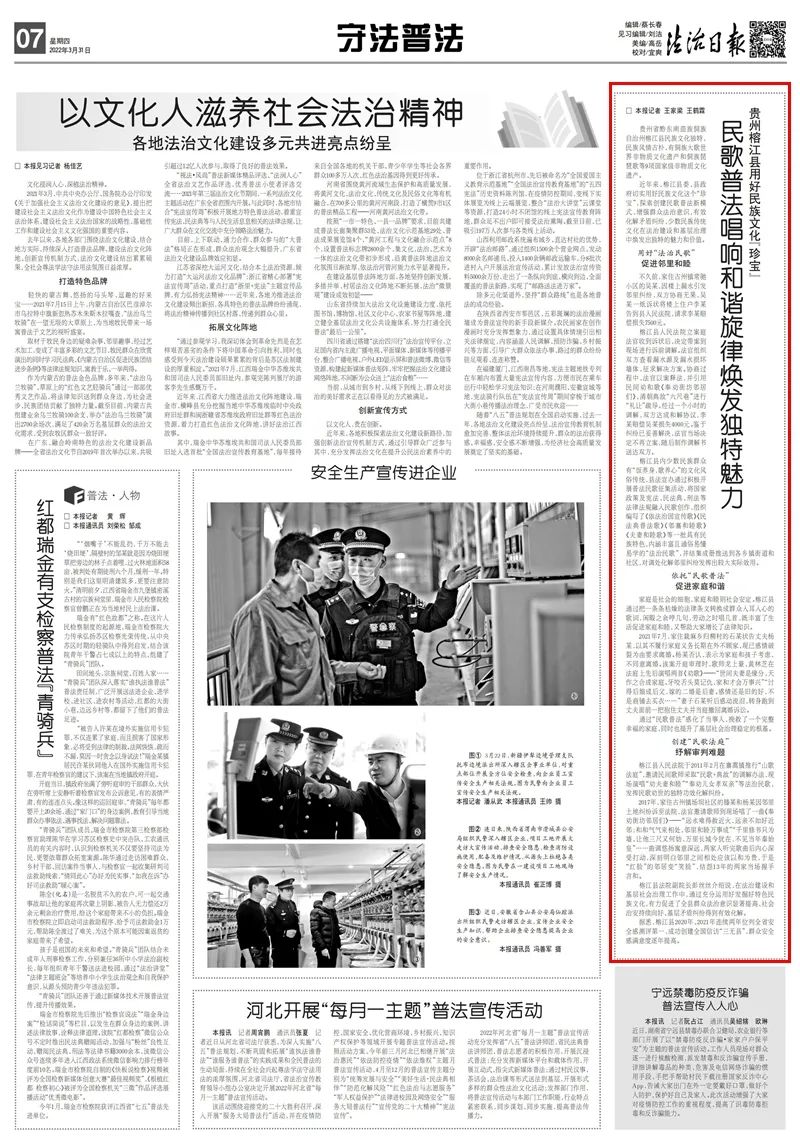 3月31日,《法治日报》守法普法版刊发了《贵州榕江县用好民族文化“珍宝” 民歌普法唱响和谐旋律焕发独特魅力》的文章。