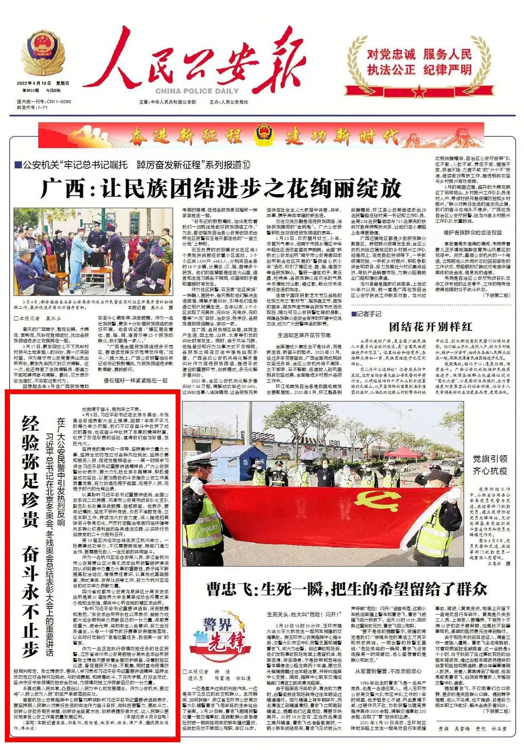 坚持党的集中统一领导,坚持集中力量办大事,坚持主动防范应对各种风险挑战,坚持办赛和服务人民、促进发展相结合……第一时间学习领会习近平总书记重要讲话精神后,广大公安民警纷纷表示,要大力弘扬北京冬奥精神,积极借鉴成功经验,以更加昂扬的斗志推动公安工作高质量发展,努力创造无愧于祖国、无愧于人民、无愧于时代的光辉业绩。