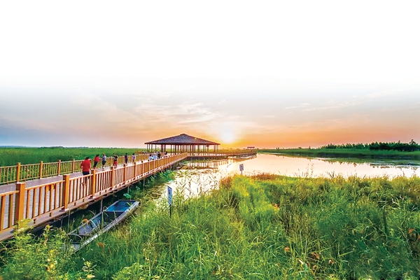 翌日,阳光清清爽爽地照耀下来。来到一座堤路上,只见辽阔的水面、远远近近的苇林,在雾霭中皴点涂抹,苍茫一片。沿岸码头整齐地停靠着一艘艘游艇。还没到旅游季节,这些游艇便厉兵秣马,休养生息,等待着一个热烈辉煌时刻的到来。