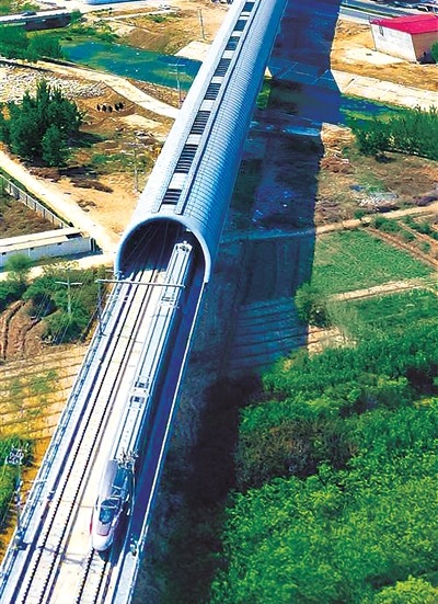 京雄城际铁路线上的国内首个350公里高速铁路钢结构全封闭声屏障,实现了高速铁路通过环境敏感区噪音控制重大技术创新。(资料图片)