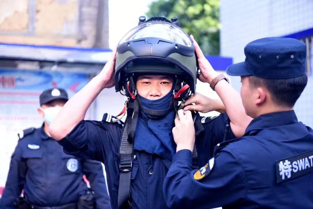 在将炮弹平稳转移到郊外一空旷地带后,排爆队员们开始有条不絮进行排爆前的准备。在队员协助下,陈林再次穿上重达70余斤的排爆服。在戴上头盔前,密不透风的排爆服已经让陈林满头大汗。