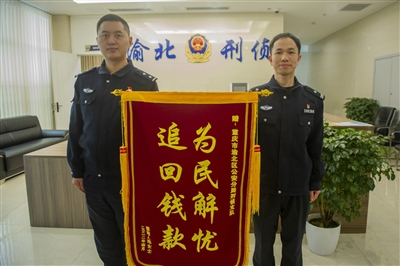 日前,陈女士特意赶制了一面印有“为民解忧 追回钱款”的锦旗邮寄到渝北区刑侦支队(如图),向办案民警表达自己的感激之情。
