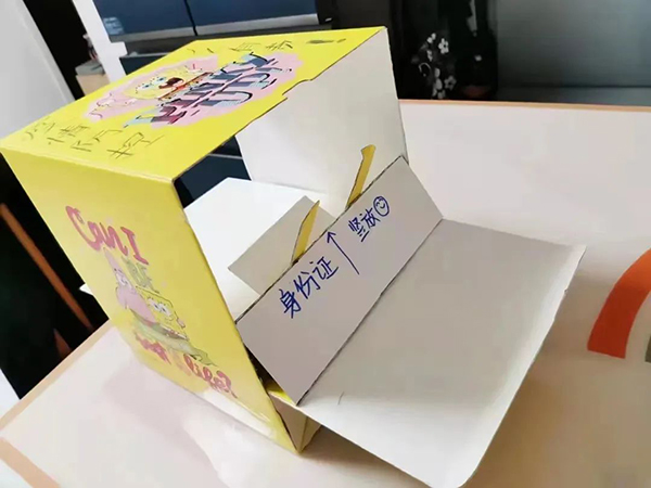 在扫描身份证登记信息时,阳光照射采集页面,经常造成录入困难、检测进度缓慢,干警发现后,发挥聪明才智,自制证件扫描纸盒。虽说就地取材略显粗糙,却有效遮挡了阳光,提高了扫描证件的准确程度,同时也避免了证件与工作人员及桌面的接触,减少传播感染风险,成为了检测现场的“神器”。