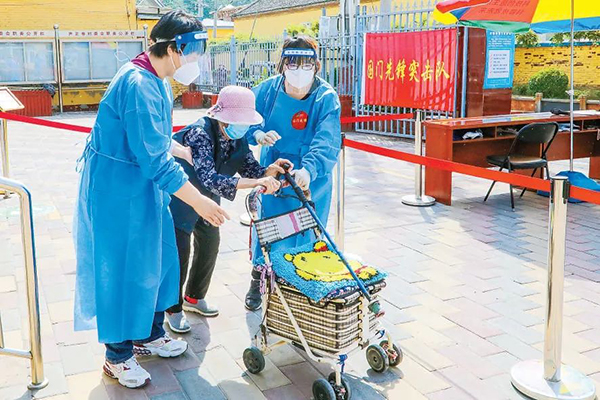 国门先锋助力抗疫。昨天,在顺义区牛栏山镇芦正卷村核酸检测现场,“国门先锋”志愿者帮助老年人和其他有需要的村民进行核酸检测。近日,牛栏山镇党员、民兵和热心居民组成400余人的志愿者队伍,持续服务疫情防控一线。北京日报记者 武亦彬摄