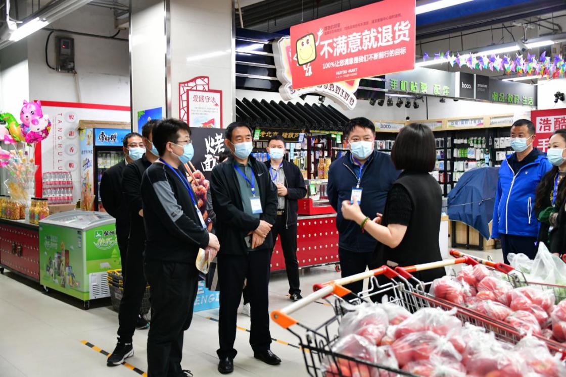 图为保定市纪委监委监督检查组走访徐水区某超市,对蔬菜、米、面、油等物资供应情况进行监督检查,询问包联社区的需求量,配送衔接等问题,确保封控居民“食无忧”。