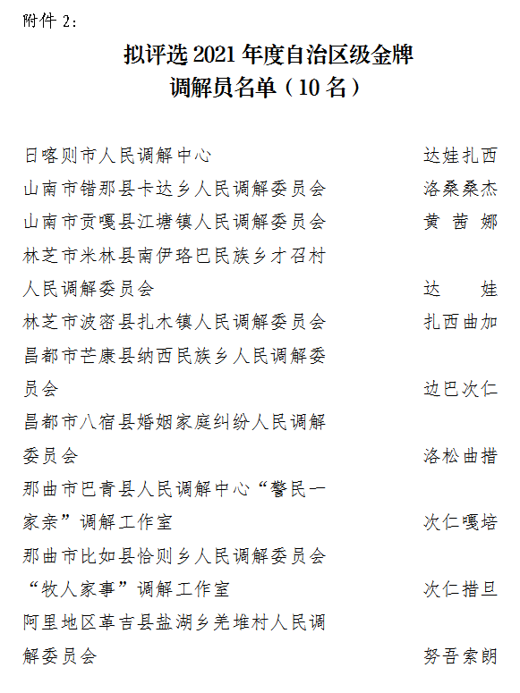 根据《西藏自治区司法厅关于印发<西藏自治区金牌调解工作室和金牌调解员评定工作实施方案>的通知》要求,西藏自治区司法厅决定拟评选2021年度自治区级金牌调解工作室9个、金牌调解员10名。现将拟评选名单予以公示,公示期为5个工作日(2022年5月16日至5月20日)。