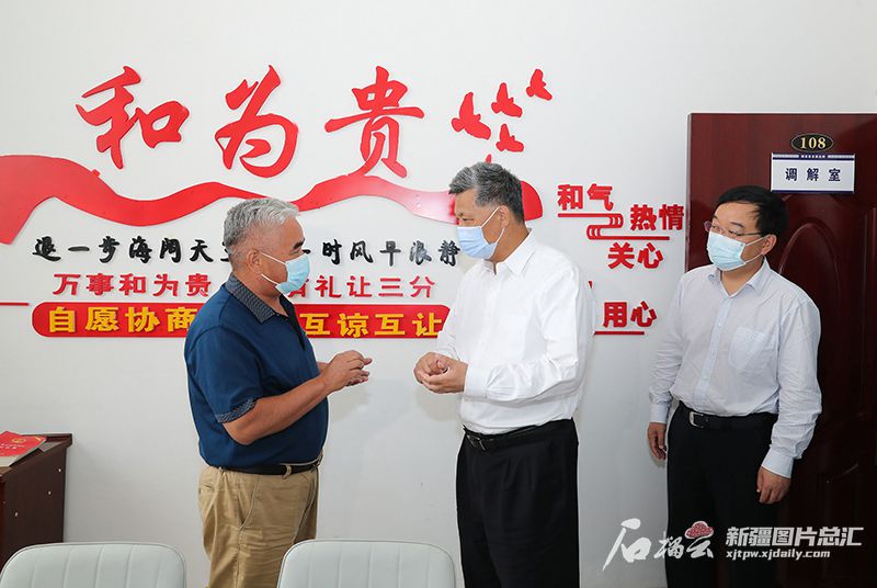 5月17日,自治区党委书记马兴瑞在和硕县特吾里克镇同人民调解员交谈交流,了解社会矛盾纠纷多元预防调处化解综合机制。天山网-新疆日报记者崔志坚摄