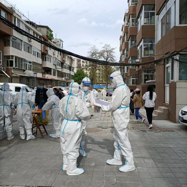 图为承德市纪委监委应急防控预备队在小区开展志愿服务,帮助统计居民核酸检测情况。
