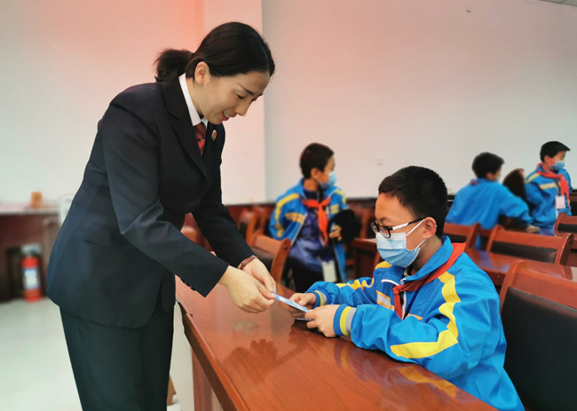 张芳在一所中学开展"法治进校园”活动