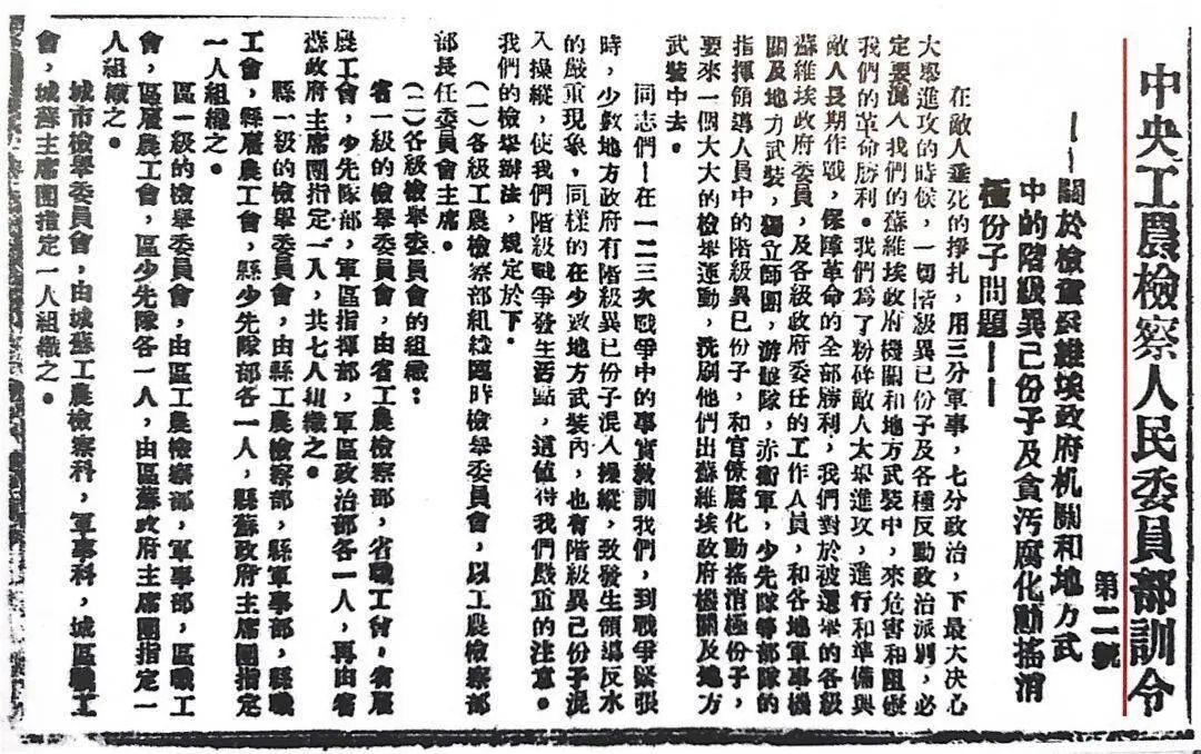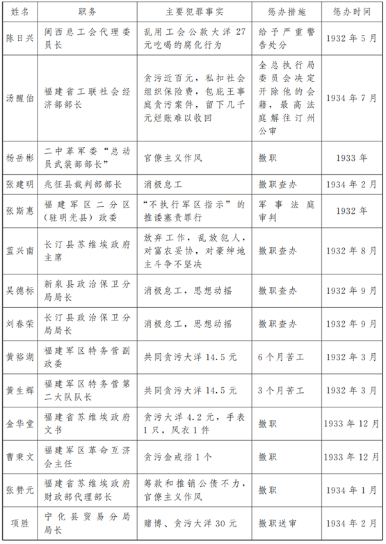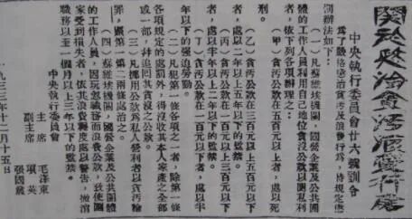 严厉惩治贪污腐败 针对中央苏区没有惩治贪污浪费行为的专门法律,造成苏维埃临时最高法庭在审理此类案件时,审判依据不明确,量刑标准不一致的情况,经过反复酝酿和讨论,1933年12月15号,中华苏维埃中央执行委员会制定了《关于惩治贪污浪费行为》的训令。这个训令是中国共产党第一个完整的以反贪污浪费为主要内容的法律文献,成为我党深入推进廉政建设和反腐败斗争的一个里程碑。 训令规定“凡苏维埃机关、国营企业及公共团体的工作人员,利用自己的职权贪污公款500元以上者,处以死刑;贪污公款在300元以上500元以下者,处以两年以上五年以下的监禁。”同时规定上述人员“因玩忽职守而浪费公款,致使国家受到损失者,依其浪费程度处以警告、撤销职务及至一个月以上三年以下监禁。” 1934年1月4号,中央工农检察部指示“对贪污分子及重大的浪费分子都应举行群众公审”,经大会批斗后,送法庭裁决。中央政府总务厅干部左祥云在任职期间贪污公款246元7角,还盗窃红军的秘密军事图纸献给国民党军。1934年2月,临时最高法庭公开审理此案,判处左祥云死刑,到庭旁听者达数百人。 苏区时期被查处的部分贪官污吏坚决打击官僚主义 在惩治贪污腐败行为的同时,苏维埃政府也对官僚主义进行了严厉打击。1932年,《红色中华》刊登了福建省工农检察部工作总结中指出,福建省龙岩、长汀两县工农检察部扩大和优待红军工作做得不够,批评控告工作力度不够。据此,9月4号,福建省工农检察部联席会议规定:“严格的检查政府工作人员不积极领导群众及地方武装与敌人作坚决斗争及敌人未来而先恐慌逃跑的事情”“与政府机关的形式主义、官僚主义作坚决的斗争”。 1933年8月,毛泽东在中央苏区召开的一次经济建设工作会议上对官僚主义做了归纳,“一种是不理不睬或敷衍塞责的怠工现象”“另一种是命令主义”。毛泽东还指出:“当着国民党贪官污吏布满全国,人民敢怒而不敢言的时候,苏维埃制度之下则绝对不容许此种现象。” 《红色中华》根据毛泽东的论述,批判官僚主义的八种表现(部分) 1934年1月22号,第二次全国苏维埃代表大会召开。大会指出:“各级工农检查委员会,必须经过各种团体,领导广大工农群众,来进行反官僚主义的以及反贪污浪费的斗争”。打击官僚主义这一毒瘤,成为当时中央苏区反腐败斗争的重中之重。 1934年春,为了整顿裁判部工作,中央司法人民委员部一口气撤换了“动摇妥协”的粤赣省苏裁判部长李世森,以及消极怠工的兆征、汀东、上杭等10个县的裁判部部长。同年3月,福建军区军事法庭审判了二分区政委张斯惠的“不执行军区指示”的推诿塞责罪行。一系列反腐举措,有力推动和促进了苏区的廉政建设。 《红色中华》对工农检察委员会查办贪污案件的报道 修改话题添加话题 2021年7月 在中国共产党成立100周年之际 福建省高级人民法院 福建省广播影视集团融媒体资讯中心 福建新闻广播 联合推出百集历史印象志 《共和国法治从这里走来》 追寻上世纪二三十年代 闽西苏区如何孕育了红色法治 创造了我党法治建设史上的诸多第一 成为共和国的“法治摇篮” 听一声霹雳破混沌 看血染红旗铸法魂 ……