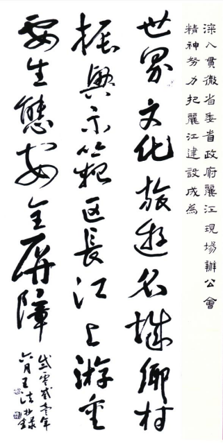 该书法作品,出自全国著名的无臂口书书法家和志刚先生之笔,内容为习近平总书记语录。丽江市各级纪检监察机关自觉向习近平总书记“我将无我”的崇高境界和“得罪千百人,不负十三亿”的鲜明立场看齐,坚决和腐败现象作斗争。五年来,丽江市纪委监委共立案审查调查2086件2348人。