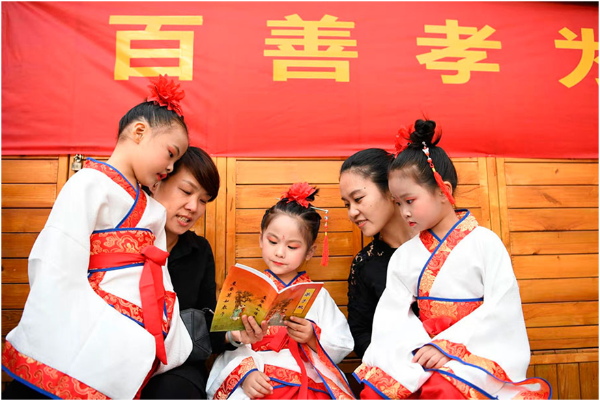 福建省泉州市丰泽区开展“一镇一孝廉”活动,学生和家长共读《弟子规》。