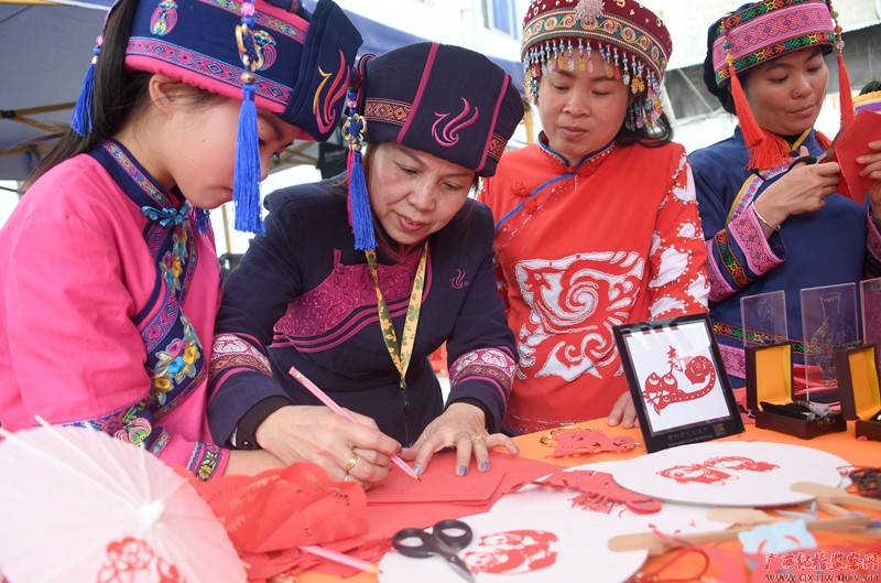 仫佬族剪纸技艺,是仫佬族妇女用白纸或红纸,裁剪麒麟、门神等吉祥图案,或“福”“喜”等吉祥文字,作为家居装饰;或剪成模型用来纳鞋、刺绣、雕刻花窗等,是仫佬族人民历代传承的传统美术。图为“仫佬族剪纸技艺”代表性传承人罗华清现场创作廉洁作品。(廖光福/摄)。