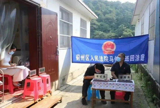 日前,在蓟州区穿芳峪镇某村村头,进行了一场特别的庭审。在庭审现场,马伸桥巡回法庭的法官和书记员找来桌椅板凳,坐在原告与被告房屋之间,背靠大山,开庭审理了双方的财产损害案件。