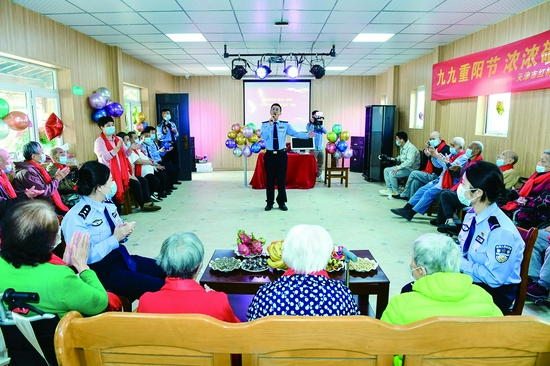 秋风送爽,丹桂飘香。在一年一度的重阳节到来之际,本市公安机关采取多种形式关心关爱老年人,帮助解决实际困难,弘扬敬老、爱老、助老的优良传统。图为红桥分局青年民警来到汇福老人院开展献爱心慰问活动,帮老人打扫卫生、修剪指甲、梳理头发,并与老人一起举办联欢会,在欢歌笑语中共度重阳佳节。