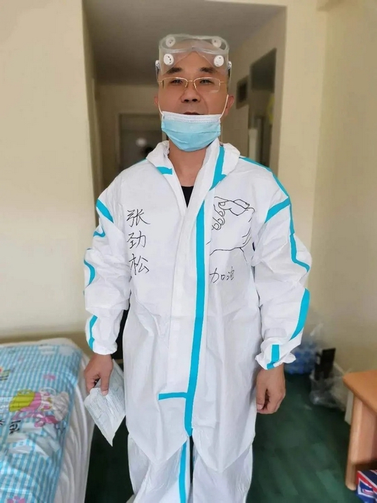 谷书锋是个闲不住的人。在行政区隔离备勤时,有天晚上下了雪,第二天早上天刚亮,他就拿着铁锹到楼下铲雪。进入监管区,他也闲不下来,主动承担起消杀任务,光是领送药桶,老谷每天就要跑3个来回。他就这样从严冬跑到盛夏,跑了141天。