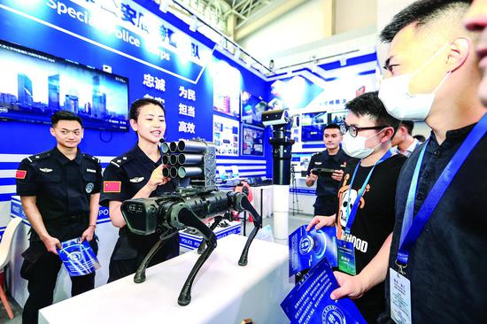 7月8日至9日,市公安局在梅江会展中心举办第三届公安科技创新成果展,集中展示天津公安利用人工智能、移动警务等新技术,在提升公安机关战斗力、推进社会管理创新、深化惠民服务等方面的科技创新成果,广泛宣传警用新技术、新产品、新动态。图为公安特警总队讲解员向参观人员展示集多种警务功能于一体的机器狗。