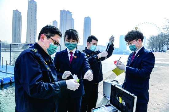 为营造河清、水美、岸绿的良好生态环境,巩固河道水源专项整治成果,日前,红桥区检察院主动发挥公益诉讼职能作用,会同区生态环境监测中心对区域河流点位进行水样采集,对水质异常情况做到早发现、早处置,坚决杜绝影响河流水质及污染事件发生。图为检察官会同技术人员在海河采集水样并现场进行水质检测。