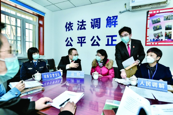 日前,全国人大代表来到河东区法院调研“一站式”诉前调解工作,详细了解了交通事故案件调解流程、鉴定途径、司法确认法律效力等事项,对交警处理交通事故、人民调解员诉前调解、法院司法确认和保险公司理赔的“一站式”工作流程给予肯定。图为人大代表(右三)现场观摩案件调解。