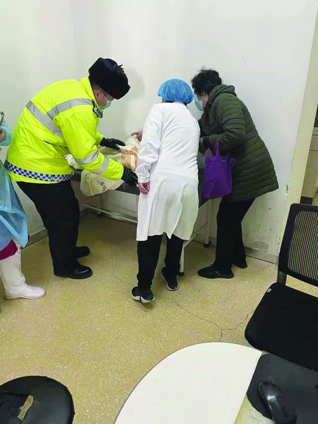 2月2日是大年初二“姑爷节”,本应欢聚一堂欢度佳节,然而一名2名孩童在家中却不慎被折叠桌夹伤手指,其左手中指、无名指受伤严重,上午9时30分,其姥姥姥爷驾车紧急将他送至市儿童医院(龙岩院区)。刚到医院门口,两位老人看到正在附近执勤的交通辅警立即求助,正在门口执勤的公安北辰分局交警支队双口大队辅警王帅和王栋在了解情况后,兵分两路,一路帮助孩童姥姥姥爷看护车辆,另一路与院方说明情况打通绿色通道。此后,王帅抱起孩子,快步奔向急诊,王栋则陪护两位老人紧随其后。经医生初步诊断,孩童手指骨折伴有皮肤严重外伤,两名辅警又帮助老人办理相应的就医手续、流程,待老人情绪稳定,孩童伤情经诊治已有效控制后,王帅和王栋这才悄悄离开医院,重新返回执勤岗位。