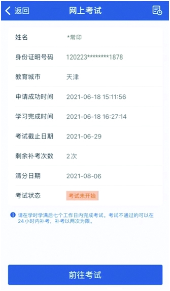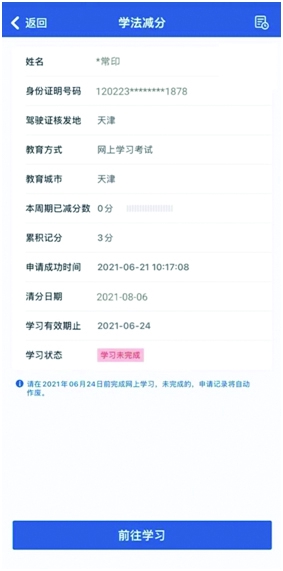 1。已完成学习的,驾驶人用户点击[学法减分]按钮,在已经完成学习的情况下,点击[前往考试]进入考试,如之前考试没通过且剩余考试次数还有的情况下,可点击[前往补考]进入补考。