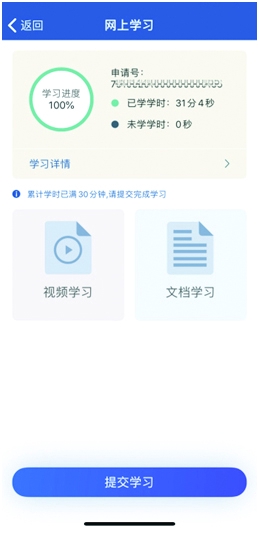 4。学时学满之后,进入该学习记录提交页面,点击[提交学习]按钮提交。