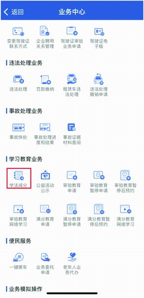 1。已完成受理的,驾驶人用户点击[学法减分]按钮,进入学习界面。