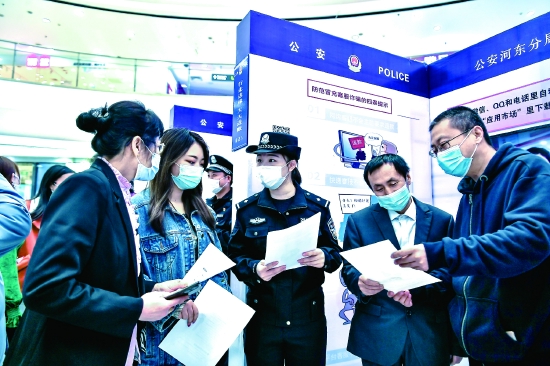 公安河东分局打防电信网络诈骗犯罪工作专班会同上杭路派出所,在河东万达广场推出防范电信网络诈骗“沉浸式”宣传展——“当”案室,通过展示各种“上当”案例,讲解防电诈“知识点”,帮助群众提高防骗意识。