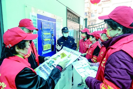 近日,一批新的志愿者穿上红马甲、戴上红袖标,加入“红哨”巡逻队。图为社区民警向新加入的志愿者讲解如何开展反电诈宣传。