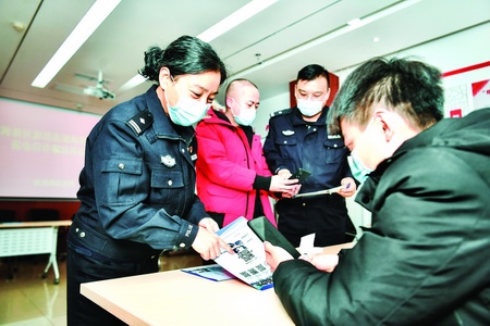 日前,滨海新区公安局天津港分局社防支队联合跃进路派出所,组织民警深入海港城社区开展防范电信网络诈骗主题宣传,介绍近期典型案例和防骗技巧,指导群众下载安装“国家反诈中心”App,共筑反电诈安全防线。