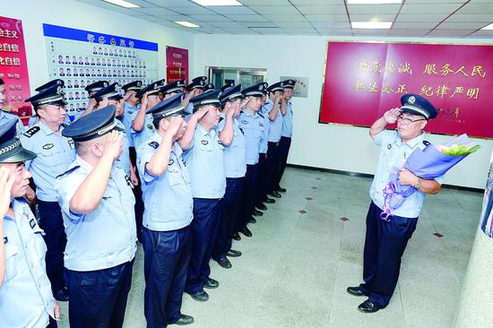 早晨7点半,老李像往常一样来到派出所,换好警服参加所里的点名会。会后,全所民警在一楼大厅整队集合,政委向大家宣布了老李退休的消息,并代表所领导班子对老李的工作给予充分肯定。青年民警向老李献上鲜花,战友们集体向老李敬礼,表达心中的敬意。