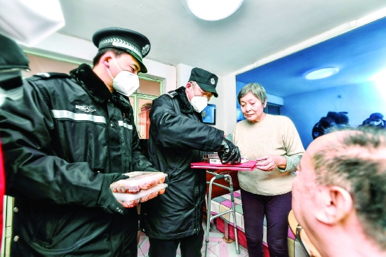 图为公安河北分局民警为行动不便、急需用药的老年人上门送药、送饭。