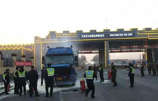 一辆重型货运车经公安蓟州分局白涧检查站由西向东绕站行驶,刚驶出站外,执勤干警发现:该车车头与车厢结合部着火!