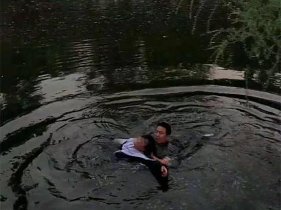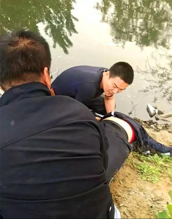 在现场周边发现有人跳入附近臭水塘自杀,处警民警奋不顾身,不顾危险,跳进恶臭的水塘内,成功救起那名欲自杀女子!