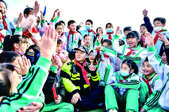 公安西青分局大寺派出所联合天津公安铁骑护卫机动队为大寺中心小学学生送上一堂安全教育课,将校园安全知识与交通安全常识相融合,“全方位”提升学生安全意识。图为民警与学生进行互动问答。