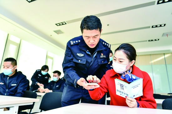 近日,滨海新区公安局环河北路派出所民警前往天津奥凯航空公司开展反诈宣传。活动中,民警通过发放宣传材料、介绍典型案例、揭露电诈手段等形式,进一步增强了该公司员工防范电信网络诈骗的意识。图为民警现场指导员工下载“国家反诈中心”App。