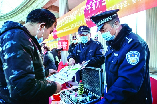 南开区政法系统各部门在华苑街道日华里社区开展法治宣传活动,为社区居民宣讲宪法、民法典、禁毒法的部分内容,介绍安全防范常识,并就居民提出的法律问题进行解答。图为公安南开分局民警向居民普及禁毒知识。