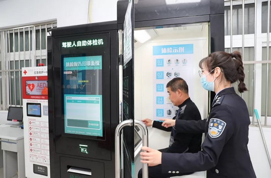 该驾驶人智慧体检一站式服务机上线后,居民携带本人身份证原件即可通过该设备完成包括躯干、上肢、视力、辨色力、听力、下肢、身高等项目的检测。待后台医疗机构审核并通过后,居民通过登录个人手机上的“交管12123”手机App,选择“期满换证”业务选项,在线进行业务申请,审核通过后新证可邮寄到家。