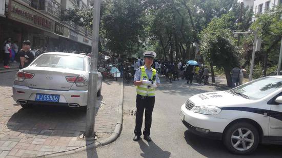 卢晓杰执勤地位于水产前街和养鱼池路交汇处,除了有十四中的考点外,附近还有几家幼儿园、小学和产业园区,平时就因道路狭窄车流量大而容易造成交通拥堵,“守护”好这些学子赴考场成为重中之重的任务。