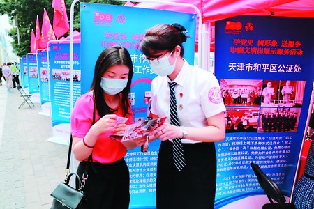 日前,和平公证处积极开展“建功十四五 擦亮窗口 巾帼先行”主题活动。 图为公证员向群众发放“民法典与公证”宣传单,帮助群众依法维权。