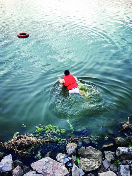 到达现场后,发现落水者距岸边较远,救援难度较大。“我水性好,我来!”58岁的老民警胡守刚自告奋勇下水救人,三下两下脱下警服换上救生衣,带着救生圈跳下了3米多高的河堤,奋力向落水者游去。